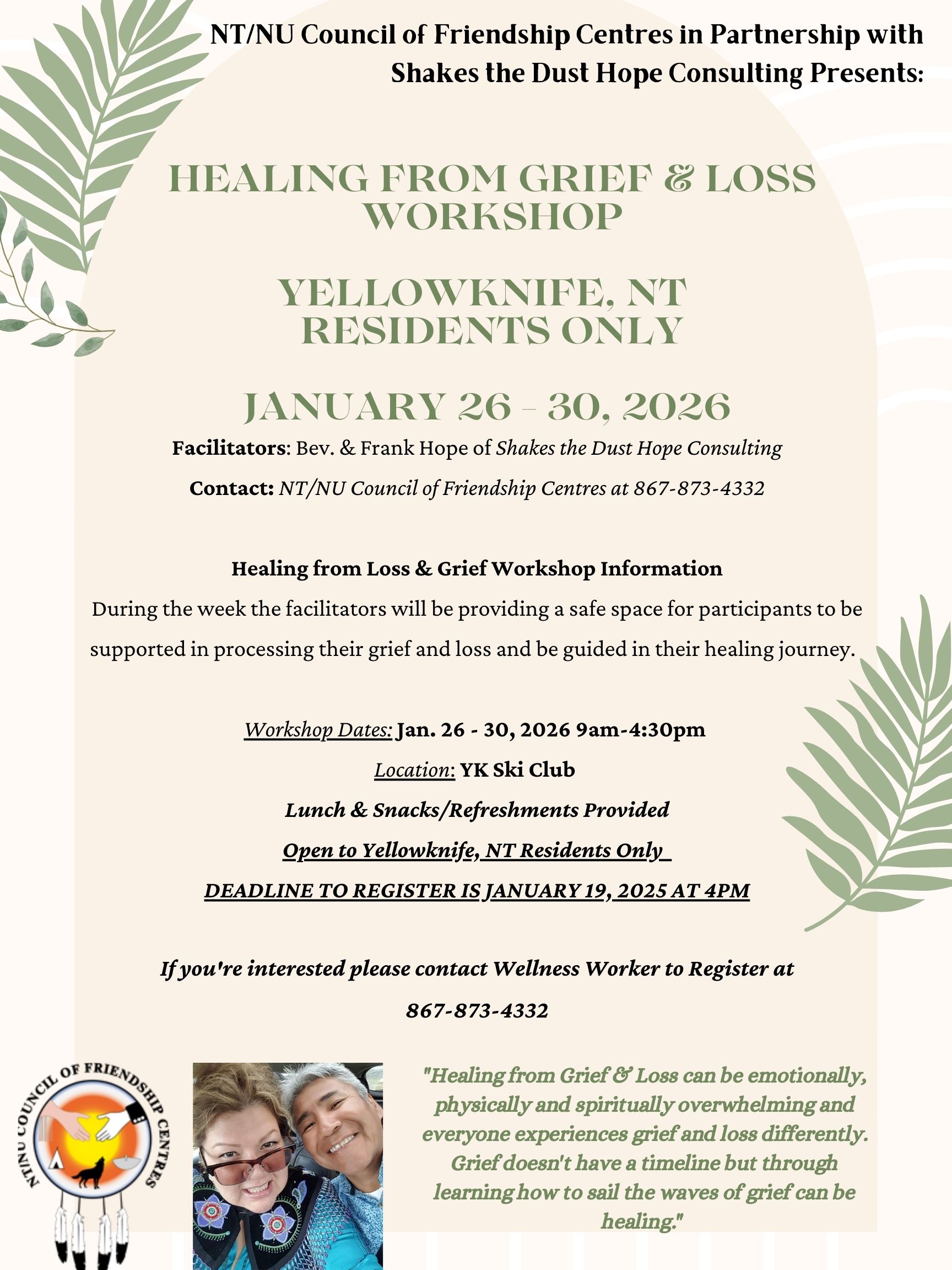 NT/NU Council of Friendship Centres in partnership with Shakes the Dust Hope Consulting invites interested Yellowknife, NT residents for a Healing from Grief & Loss Workshop from January 26-30, 2026. Facilitators Bev. & Frank Hope of Shakes the Dust Hope Consulting de